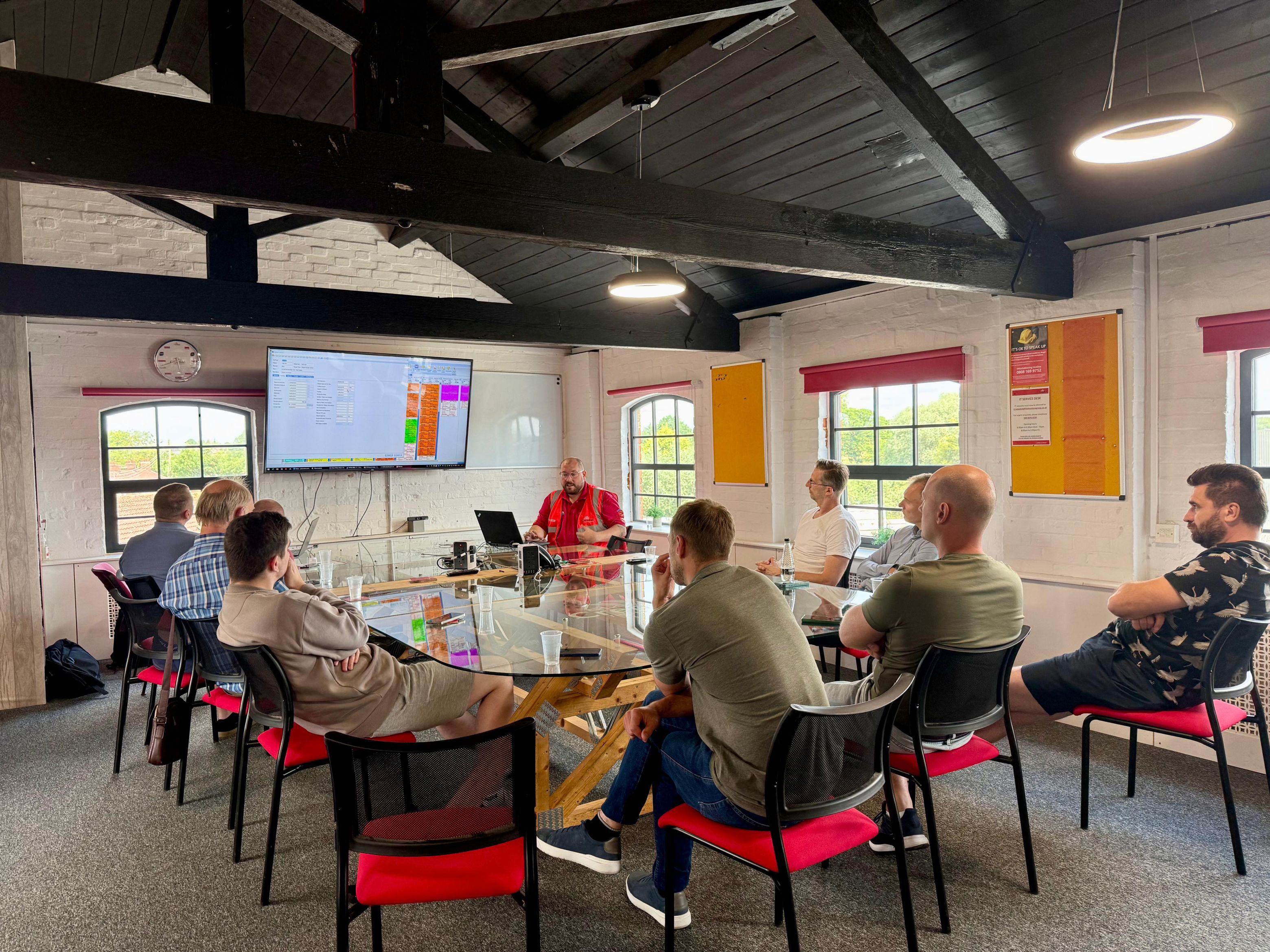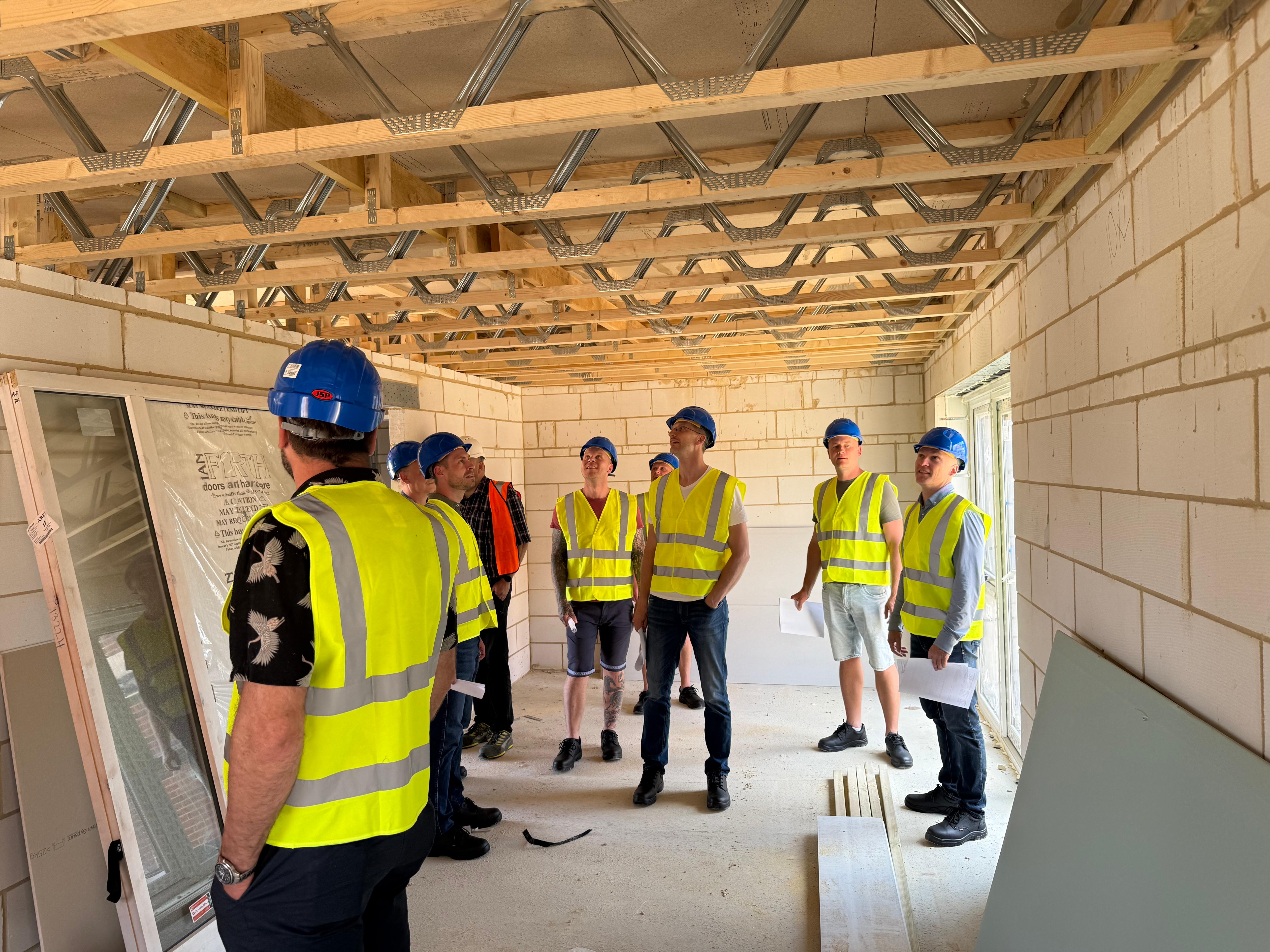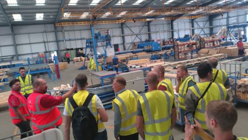 Tai buvo trumpa, bet turininga išvyka, todėl diena prasidėjo nuo Crendon gamyklos turo. Tai buvo puiki galimybė pamatyti, kaip komanda gamykloje kuria prefabrikuotas stogo ir grindų konstrukcijas naudodama MiTek Posi-Joist sistemas ir jungiamąsias plokšteles.